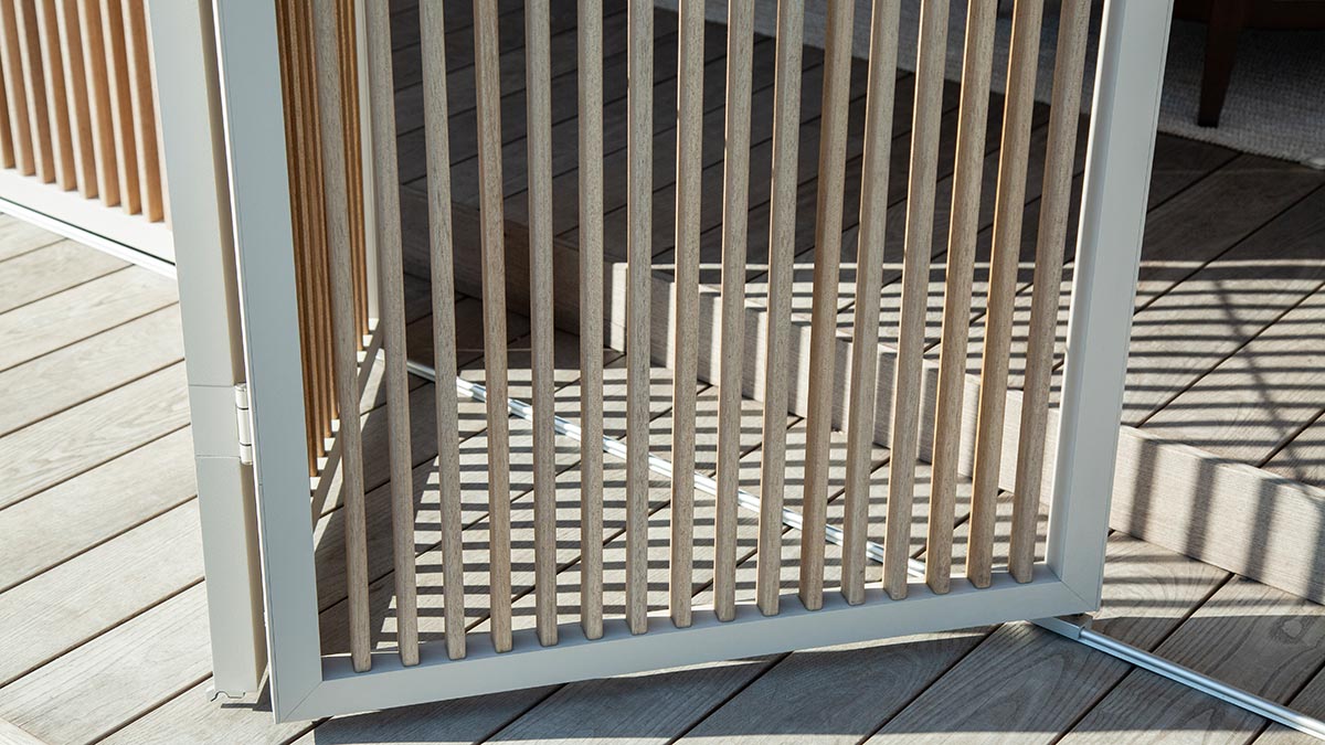 Für alle, die unter freiem Himmel leben möchten – aber nicht auf Komfort verzichten wollen. Die Lamellen lassen sich nach Belieben drehen und sogar zur Seite schieben, für einen freien Blick nach oben.
