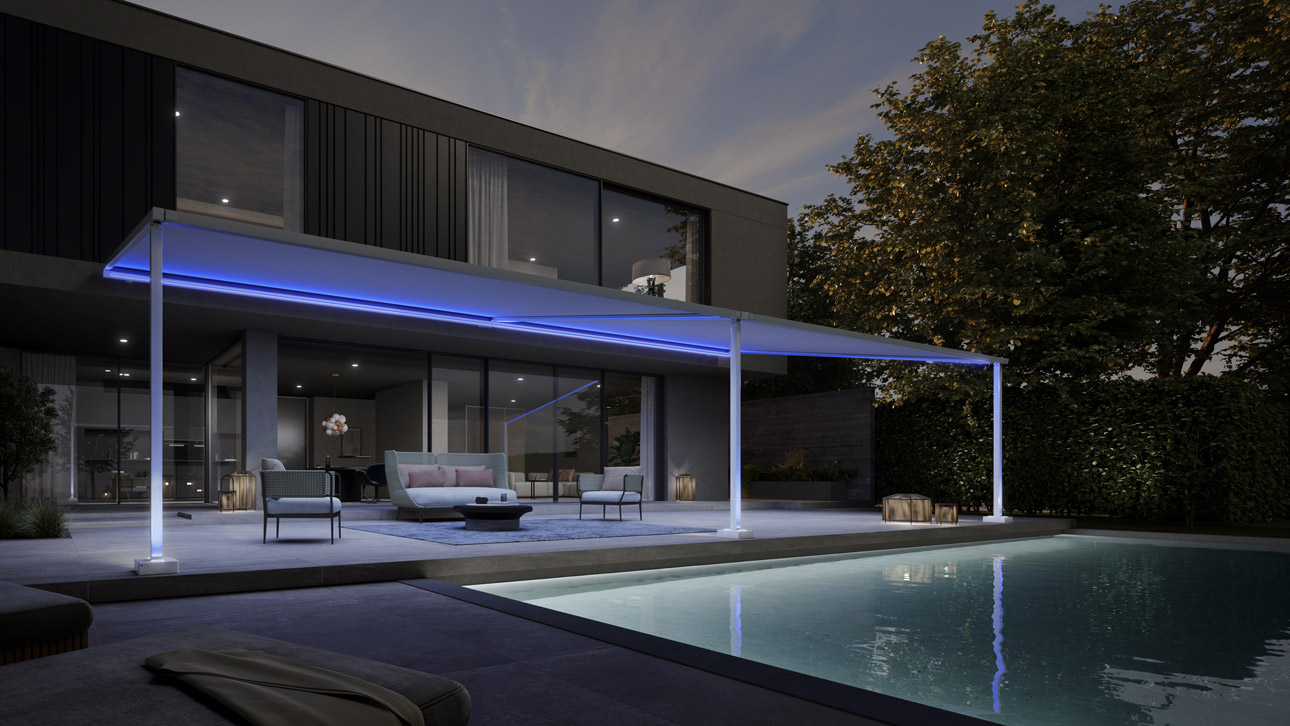 Beleuchtete Pergolasäulen (optional) und LED-Uplights oder Lines in den Fußabdeckungen (optional)